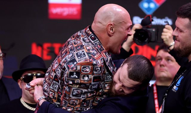 Arslanbek Makhmudov swept Tyson Fury off his feet in a bear hug when the two faced off at their final press conference on Thursday.